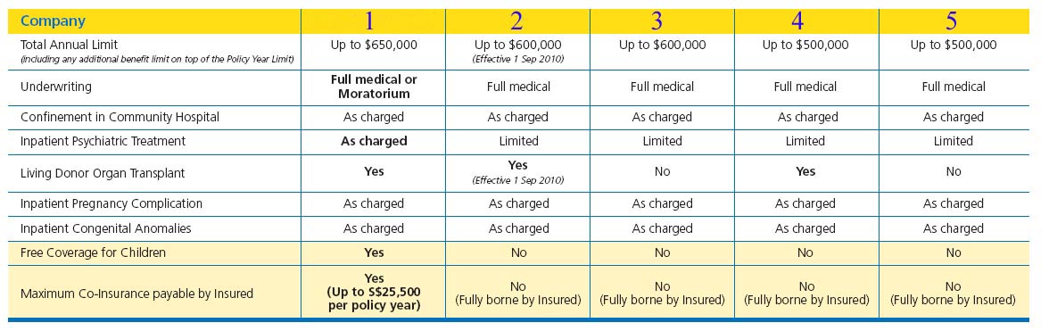 These are no fault of CPF Medishield as this plan is meant as a national medical scheme to serve the masses and to insured those who are not financially sound to get their own insurance. The authorities recognise those problems and in 1st July 2005, they open up the medishield plans to private insurance companies to insure consumer who prefers better medical attention. These plans are commonly known as ‘Medisave-approved Integrated Insurance Plans’ Or ‘Private Medical Plans(PMIs)’. There are several plans available in the market and a snap shot of the difference between them is shown here.