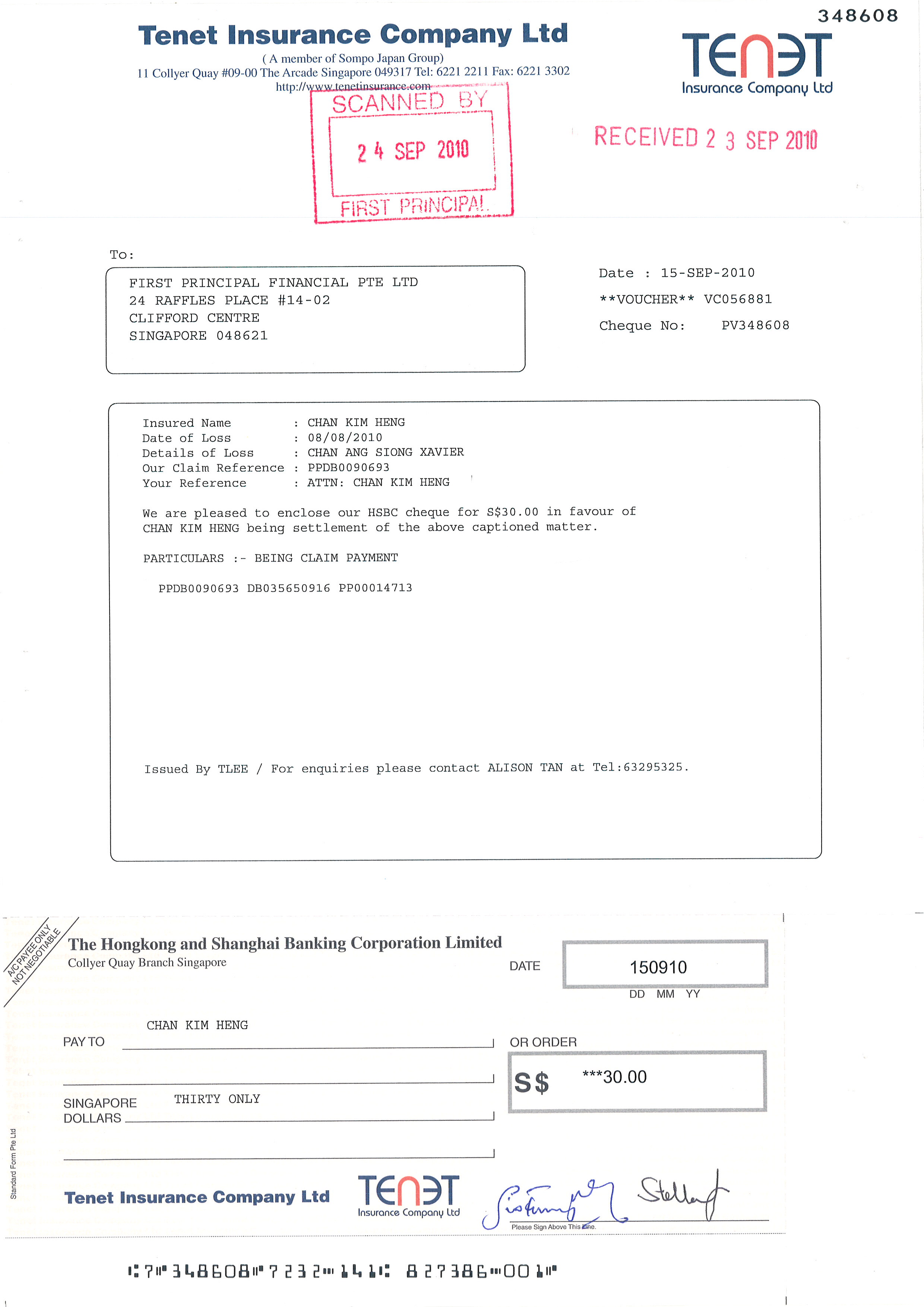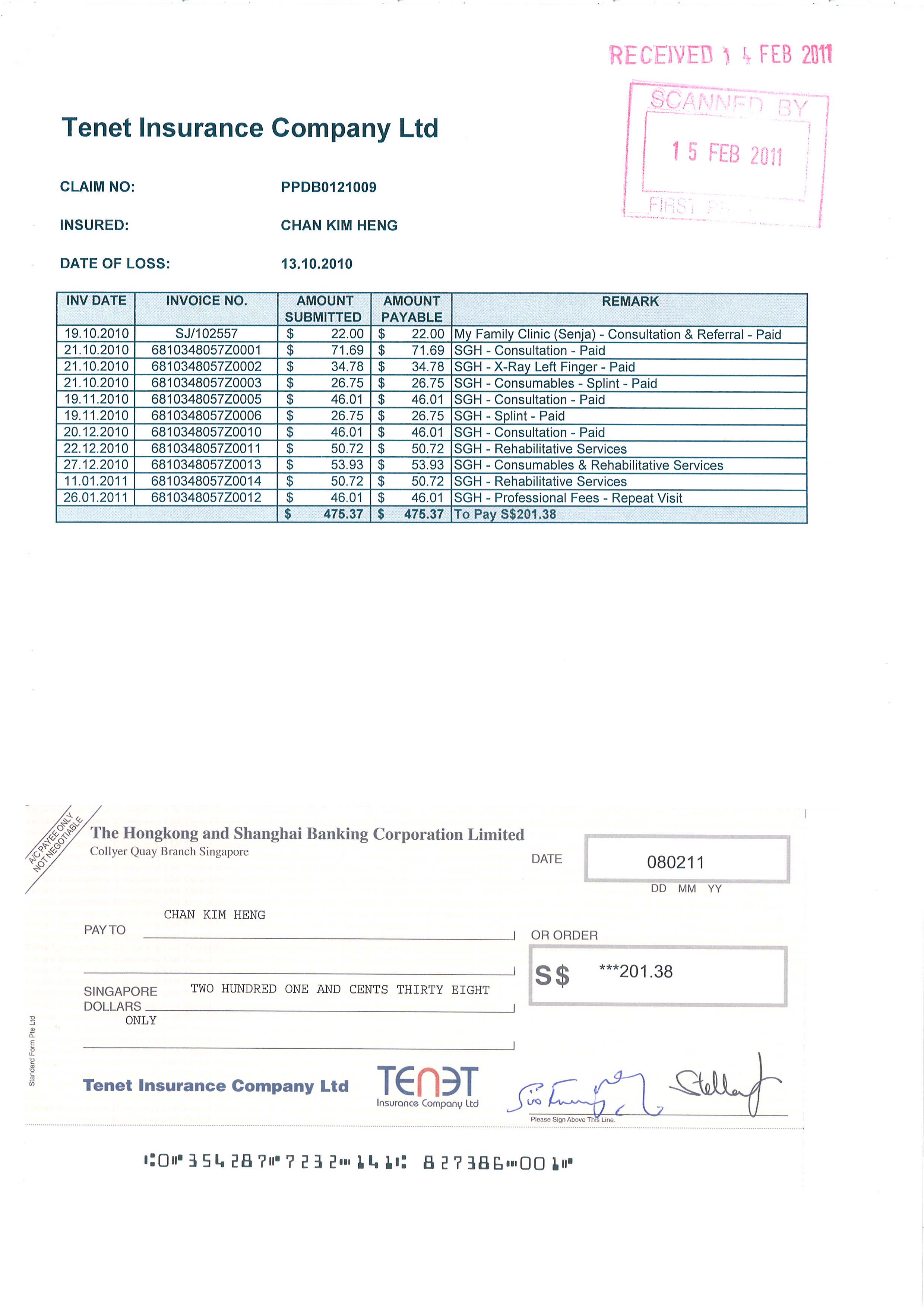 A breakdown of my consultation cost & the cheque I received is shown below. I encourage anyone who play sports or have kids who prefer jumping around than walking or are in higher risk group of contracting HFMD because they are in childcare or other schools to consider this sort of personal accident plan. I got a client who played badminton leisurely and her hand got bruised by a shuttle cock that hit her. She consult a GP and her bills was also fully settled.