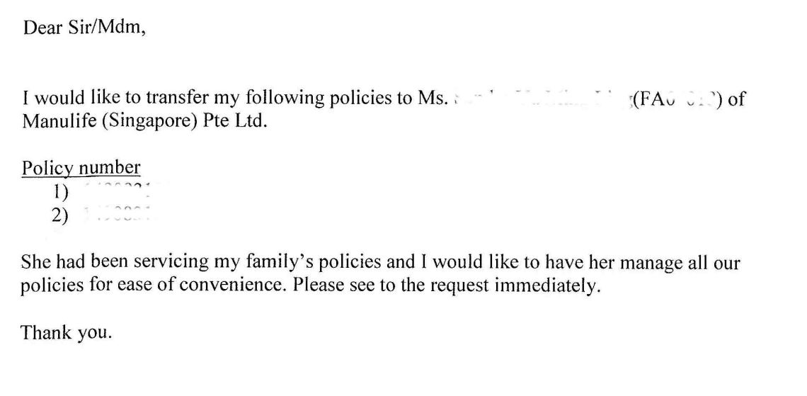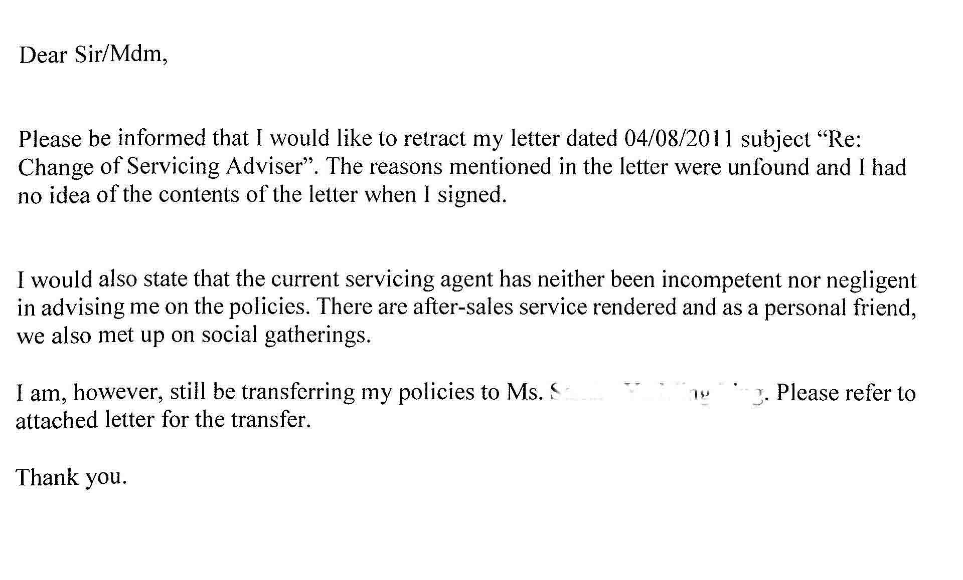 First, I got him to retract the initial letter to request for the transfer. The reason for doing this is because the initial letter was drafted by the Manulife agent and he had no idea what was the content in th “general template” when he signed on it. I felt that it was an abused of his trust. Most important of all, the agent is putting my client in a very disadvantage and dangerous position because he had signed on it. I have no intention of seeking legal action against that agent but that another banker or agent may not hesistate to do it. I cannot say that I will not seek any actions in future either. If I were to take action against the agent, I will have to take action against my client first since only hiss name and signature appear on that letter! The agent will enter into these only when my client defends himself and points the finger to the agent. Those who knows the law better may want to advice if its correct or not but nevertheless, I think it is good to discharge his own liability by this letter.