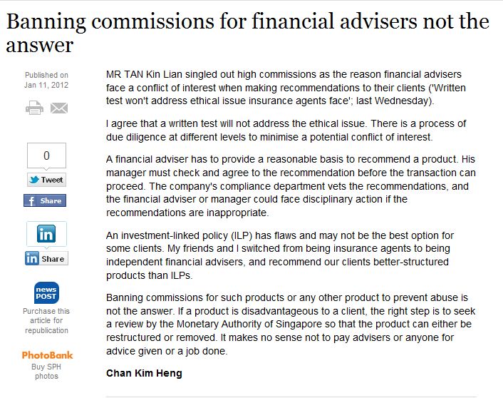 I replied to his comment and it was posted in ST Forum Online today. My reply was much edited but the points are there. I had also queried why as an Ex-CEO of a leading insurance company, he allow his company to market ILPs and he sings a different tune now. I had a screen shot of the online reply below in case you cannot access it.