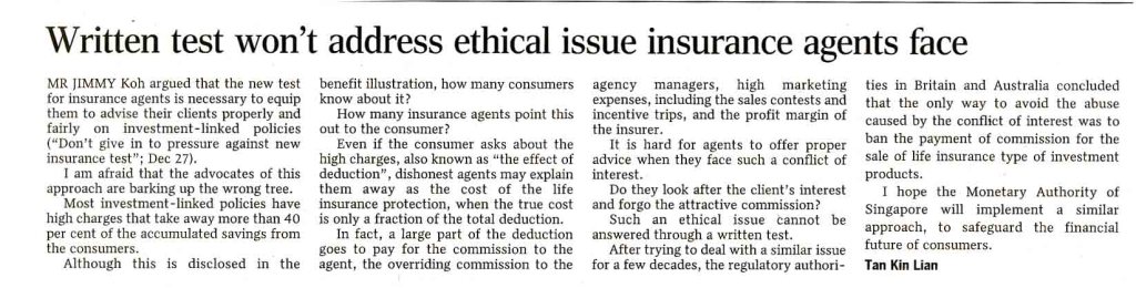 Mr. Tan Kin Lian had made some comments on Investment-linked Policy. It can also be read in the ST Forum on if the article is not clear for reading.