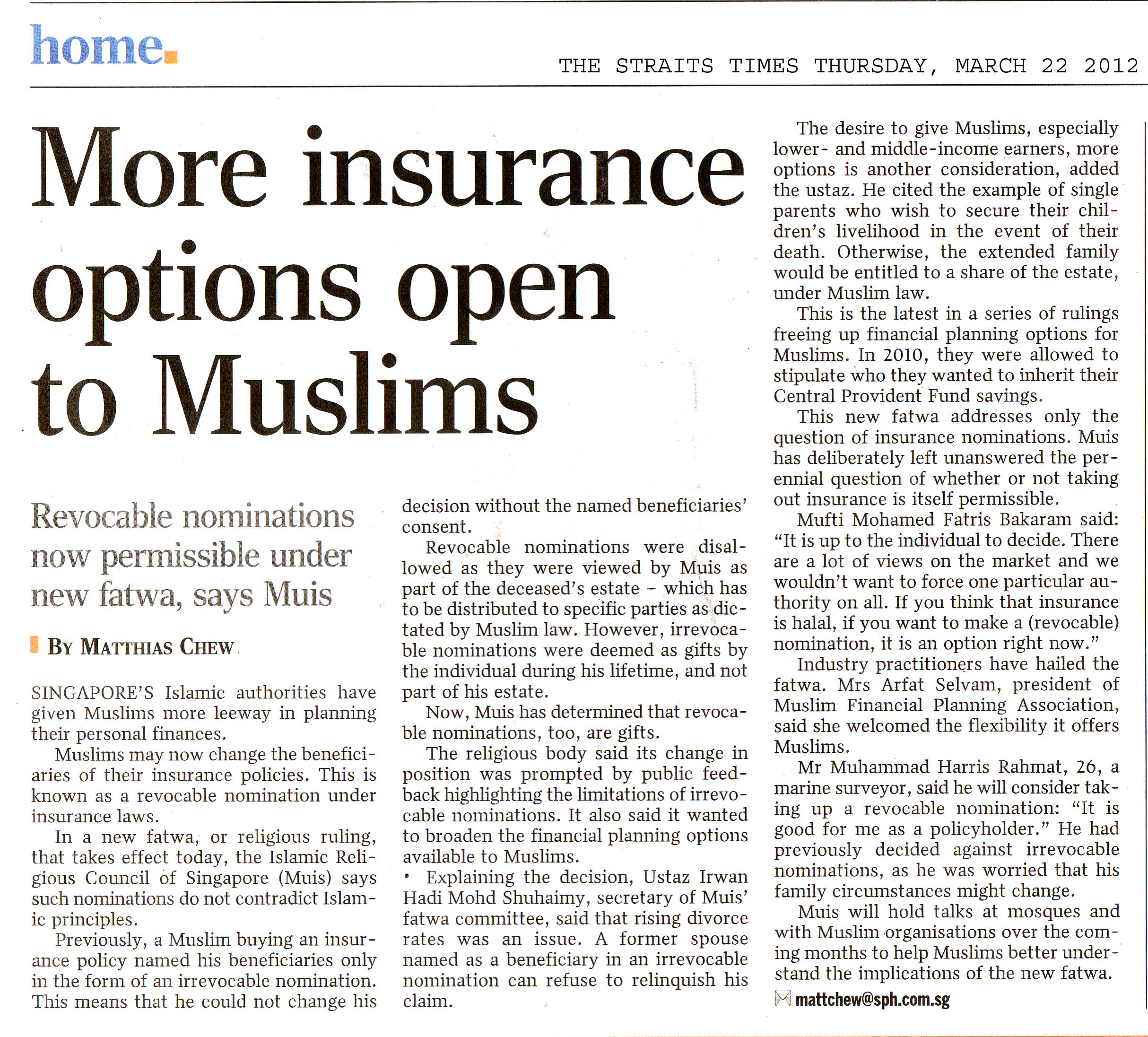 My Muslim friends and clients had always face an ‘hidden risk’ when it comes to estate distribution especially on insurance. They had assumed ,if no nomination was made, the spouse and children will get the proceeds for the insurance policy since it was purchased for the benefit of the immediate family members. However, under the estate distribution as dictated by Syriah law , it is highly possible that the majority of the proceeds end up with the deceased’s male siblings and children, leaving very little to the distraughted wife.