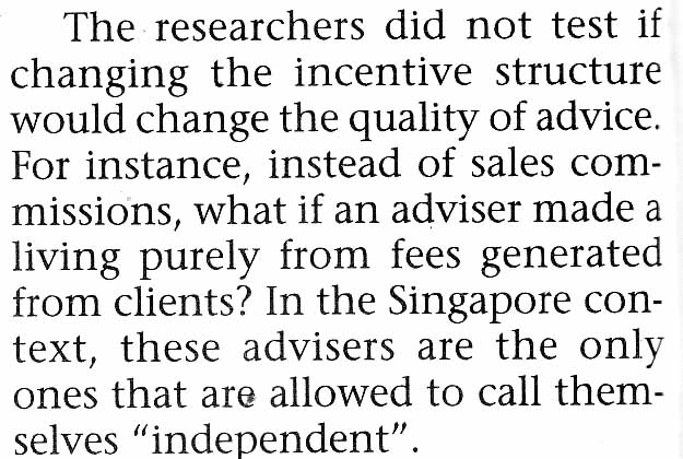However, he gave the impression that a financial adviser can use the term ‘independent’ if he charges only a fee (and not commission) for the service or advice rendered. That is wrong!