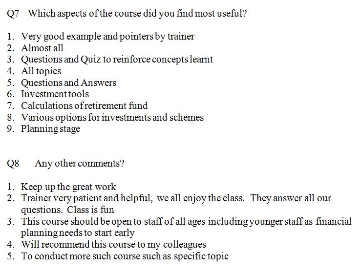 I just completed the second session with them and received their evaluation report based on the participant’s feedback and their system of assessing trainers. I am happy that the participants find the course useful and glad to see my effectiveness improved slightly as compared to the first session.
