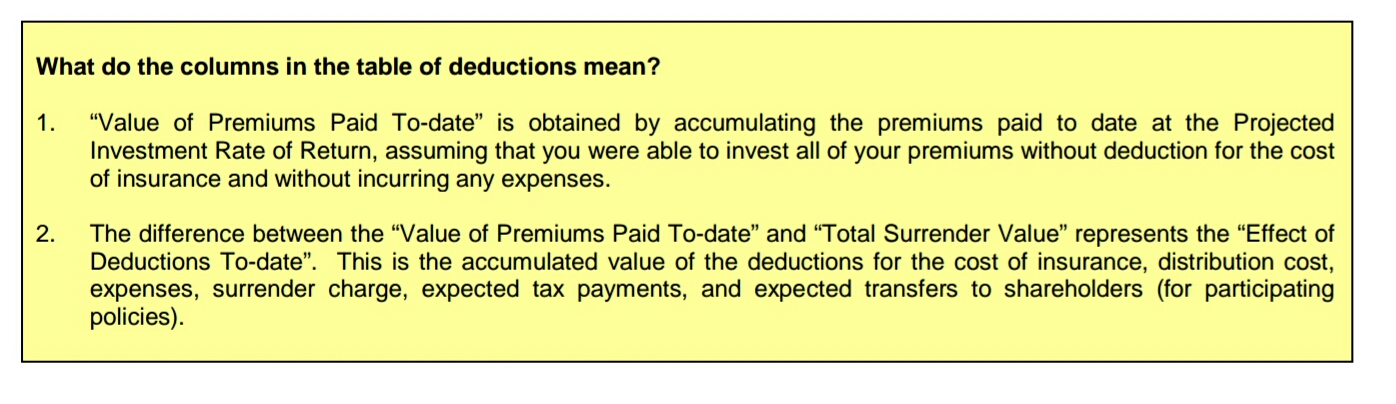 Table of deduction, on the other hand, reflects the amount of differences that you will get back from the insurance policy as compared to if you had invested that money yourself at a certain rate.