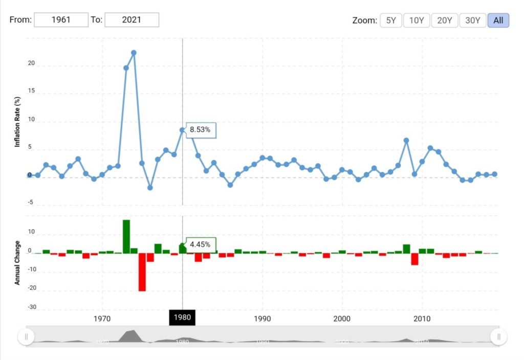 Now, let us go back to the saving interest rate. While the 8.5% p. a. on your saving account look fantastic in today’s low interest rate environment, we have to look at the inflation rate during that same period as shown below. As we can see, the inflation in Singapore during 1980 was 8.53%. So think again, is having that 8.5% high?