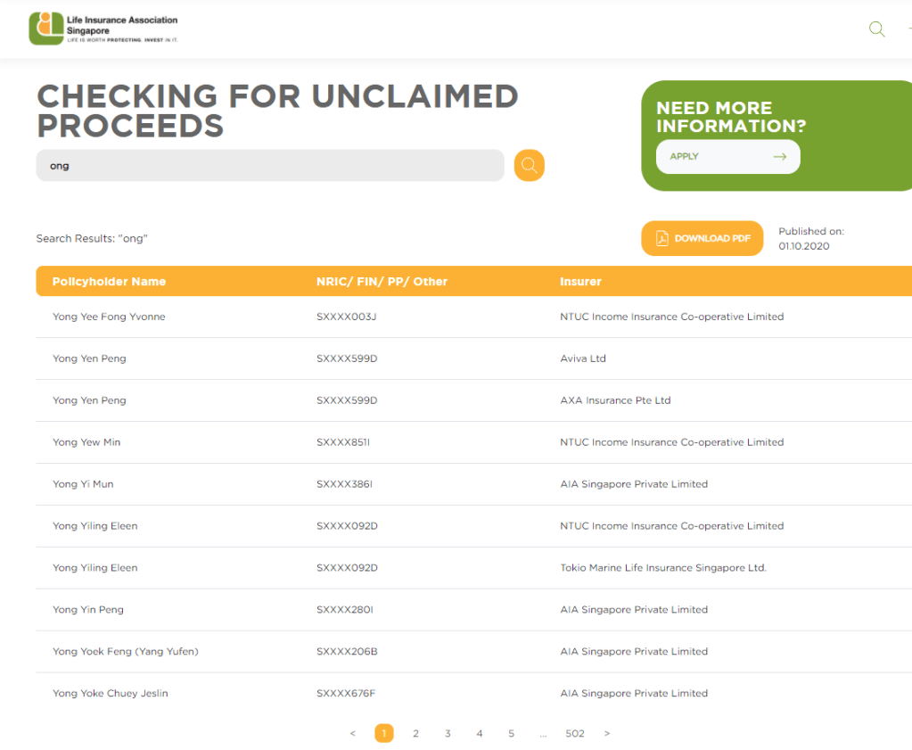 The search was randomly done base on a “ong”. The search return 10 policies in a page and there are a total of 502 pages. That is for “ong” alone… If you want to check if you are one of the lucky claimants to these policy, you can input the possible names whom may leave a sum of money for you and check it here.
