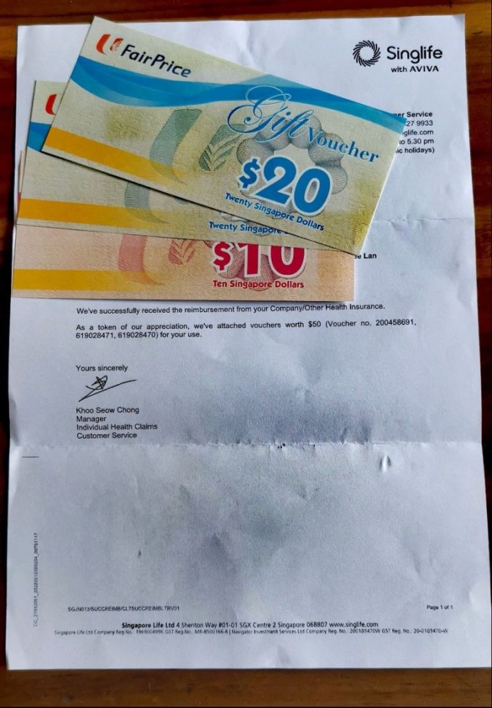 This is an incentive for my wife. Singlife which is her PMIS insurer gave her $50 NTUC Voucher after they had successfully subrogated her EB.