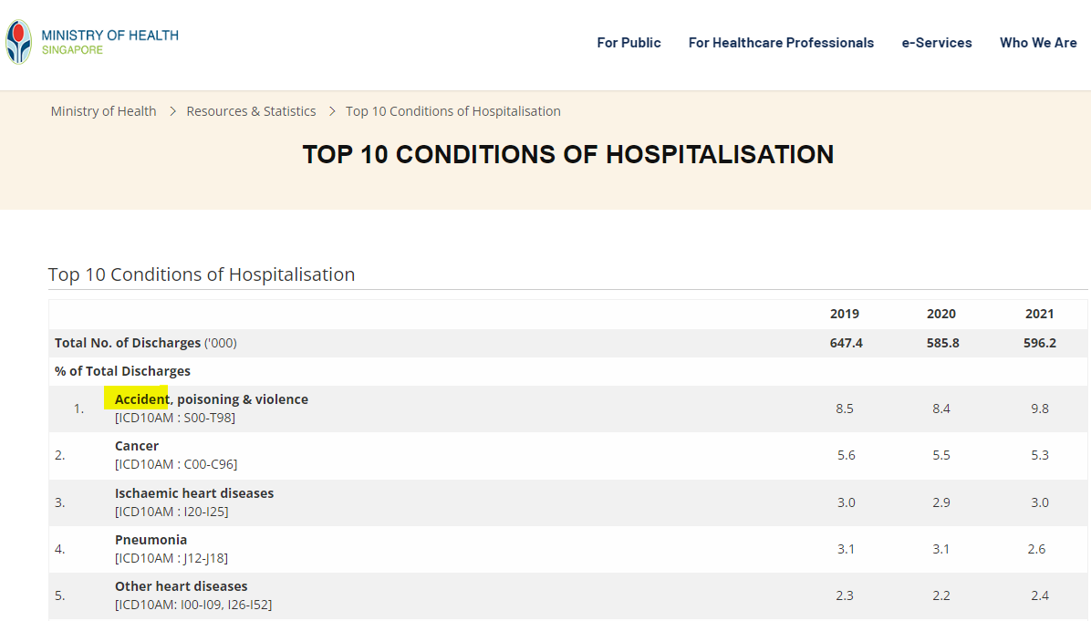 Accidents, together with poisoning and violence, are the main reason for hospitalisation. In many situations, the accidents may not be serious enough to be hospitalised. For example, spraining our ankle while playing football or other sports, burns from cooking, falling from wet floor etc. These treatment usually will not cost more than $500 and many have to come from our own pocket since we are unable to claim our integrated shield plans or employee benefits. A personal accident plan like the following may help us to mitigate the cost.