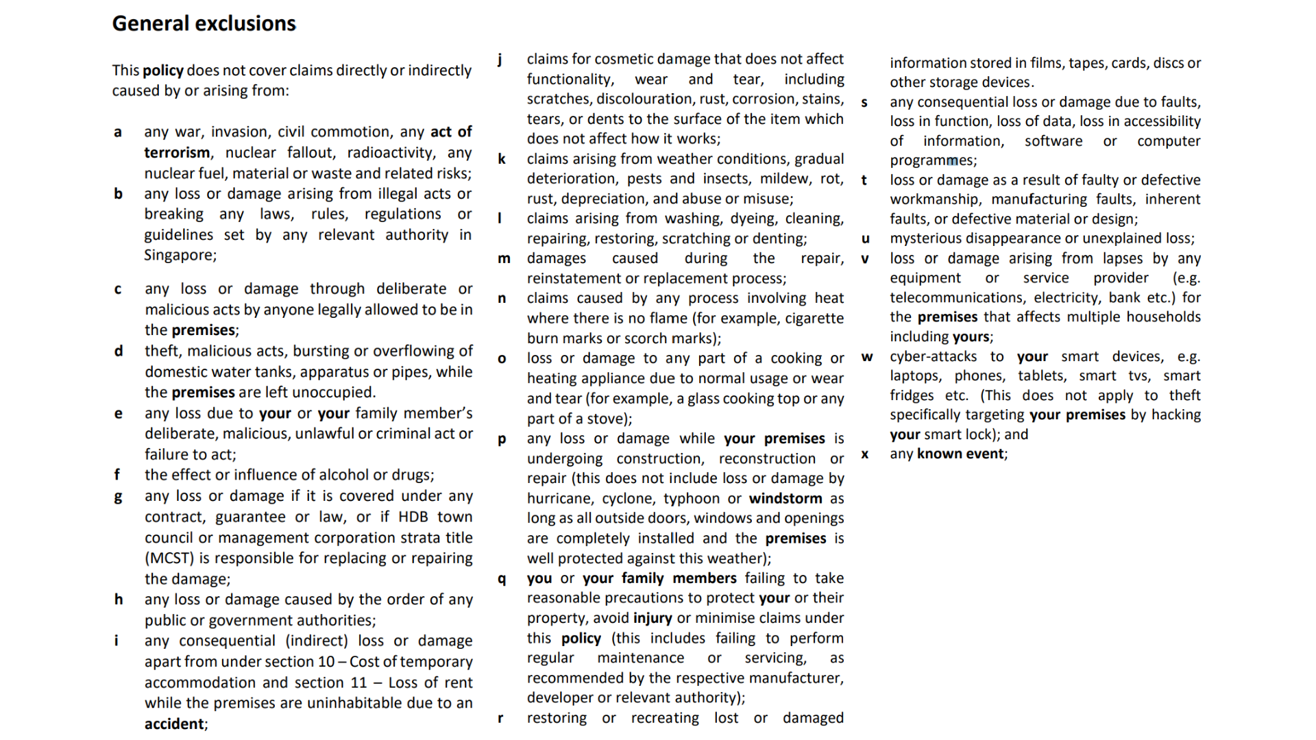 If we do not wish to be restricted by the perils, we can purchase an ‘all risks’ policy. Just to clarify, an all risk policy does not mean that it covers everything. The difference between a peril and all risk policy is a peril policy will cover only if the event is listed. However, for an all risk policy, it will not cover any event that is listed in the exclusion list. A sample of an general exclusion list is shown below. In each event, there maybe more specific exclusion stated in the policy wordings and do note the exclusion may differs between insurers.