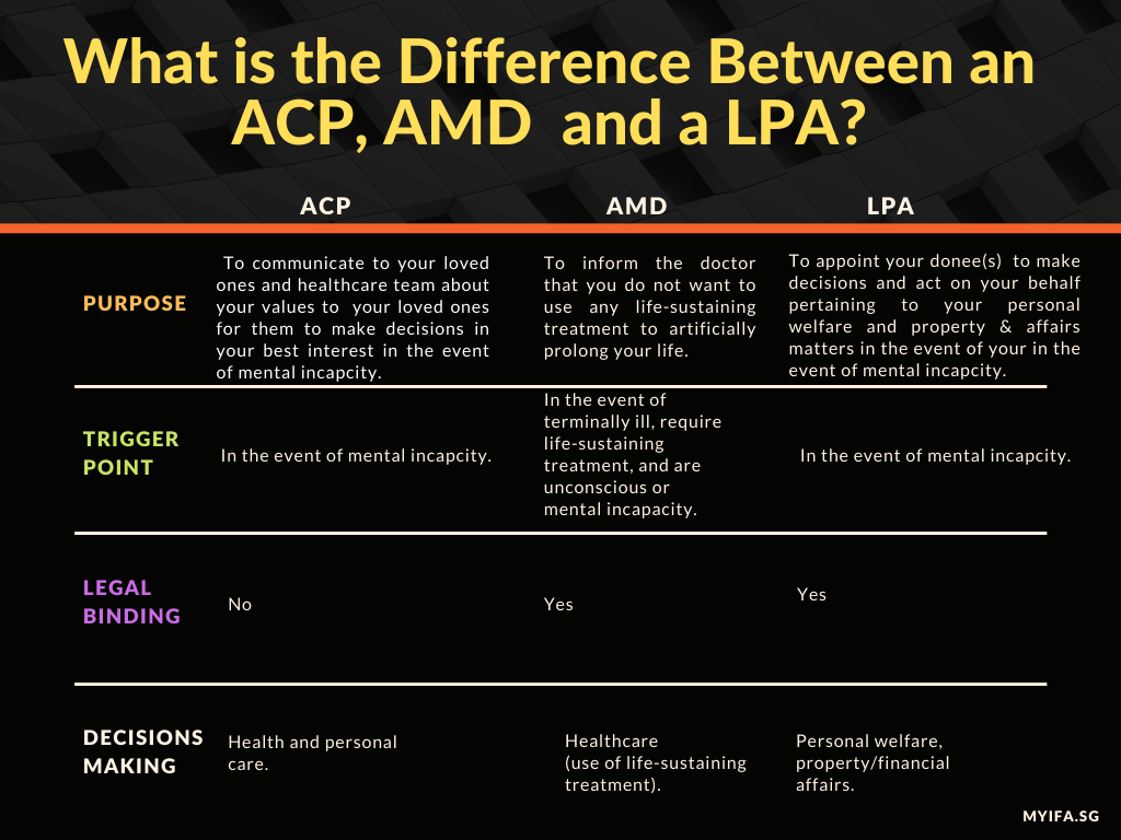 What is the Difference Between an ACP, AMD and an LPA? Kim Heng16 January 2025About Kim Heng Post navigation PreviousNext You can check on the following for details of Advance Care Planning(ACP) Advance Medical Directive(AMD) Lasting Power of Attorney(LPA) Share this:Share Click to share on Facebook (Opens in new window) Facebook Click to share on WhatsApp (Opens in new window) WhatsApp Click to share on X (Opens in new window) X Click to share on LinkedIn (Opens in new window) LinkedIn Click to share on Tumblr (Opens in new window) Tumblr Click to email a link to a friend (Opens in new window) Email Click to share on Telegram (Opens in new window) Telegram Click to share on Pinterest (Opens in new window) Pinterest Click to share on Reddit (Opens in new window) Reddit Click to share on Pocket (Opens in new window) Pocket Click to print (Opens in new window) Print Like Loading... Related