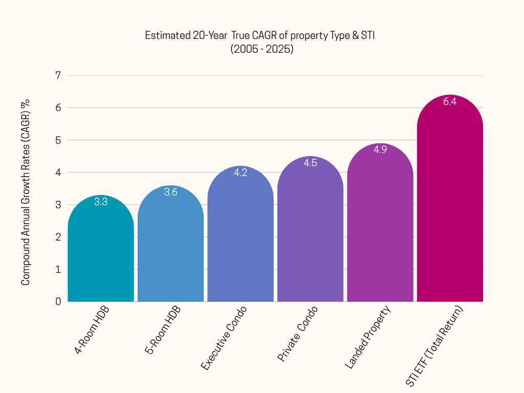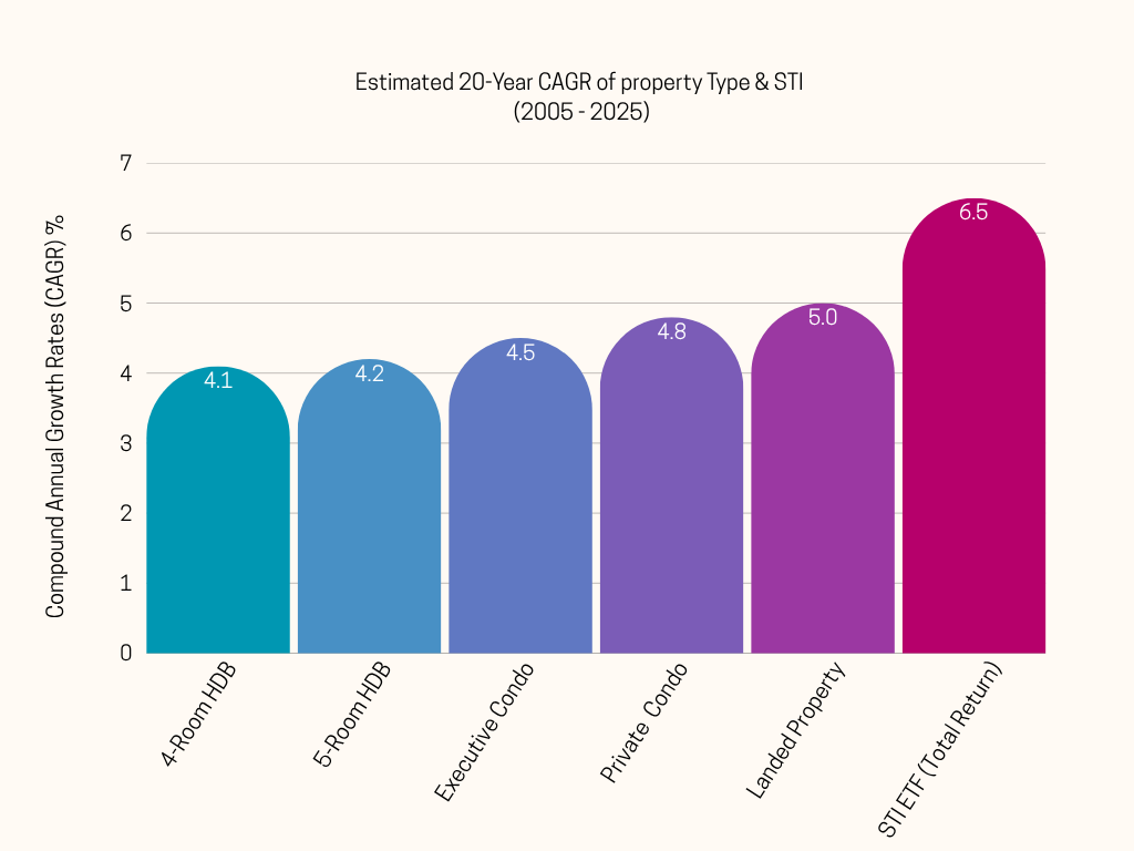 In this blog, we compare how different asset classes—4-room and 5-room HDB flats, Executive Condominiums (ECs), private condos, landed properties, and the STI—have performed from 2005 to 2025.