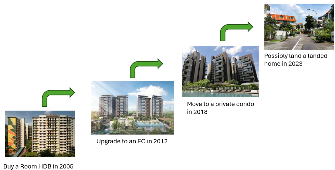 It is interesting to see while it cost much more to purchase an Executive Condominiums (ECs), private condos or landed properties which in turn allow us to sell at a much higher price, the total gain is quite similar to the 4- & 5-room HDB flats in the range of 150% to 160%.
