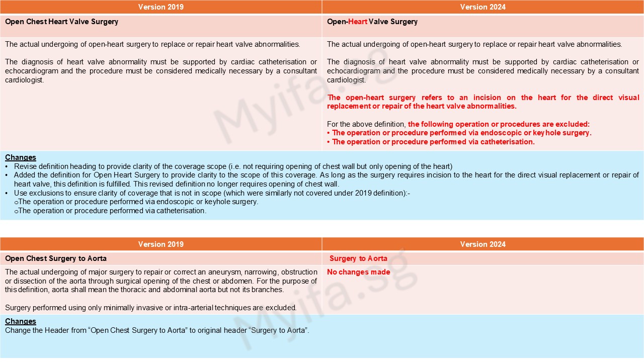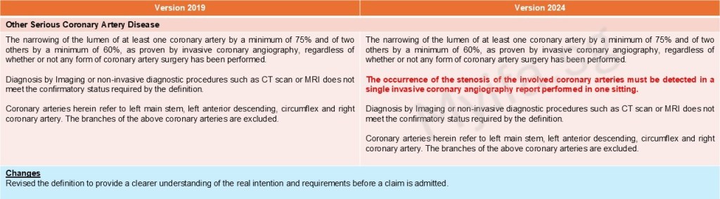 One examples of this update is the change from “Open Chest Surgery to Aorta” to simply “Surgery to Aorta.” The 2019 definition specified that the surgery had to be “open chest,” a highly invasive procedure. Today, many of these surgeries can be performed using minimally invasive “keyhole” techniques. Under the older definition, such claims could be denied since they did not meet the “open chest” requirement. To align with modern techniques, the 2024 framework redefines the condition as “Surgery to Aorta,” ensuring coverage applies to both open and minimally invasive approaches. This update ensures coverage applies regardless of the surgical method, protecting us against advancements in medical practice.