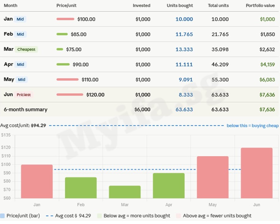 The key insight is in the “Units bought” column. Because you invest a fixed $1,000 each month, the number of units you receive automatically adjusts with the price: