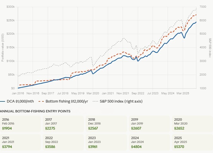The average return over the 10 yrs between DCA and BF is 10.30% and 12.64% per annum. The result is surprisingly close and that is the most powerful lesson. Even with perfect hindsight of knowing exactly which month was the cheapest each year and buying there, the bottom fishing strategy produces a mere 2.34% more over the plain disciplined DCA. The entry cards below the chart show you just how demanding “perfect timing” really is: 2016’s bottom was February, 2018’s was December, 2020’s was March during the peak of COVID panic. No real investor consistently buys at those exact moments.